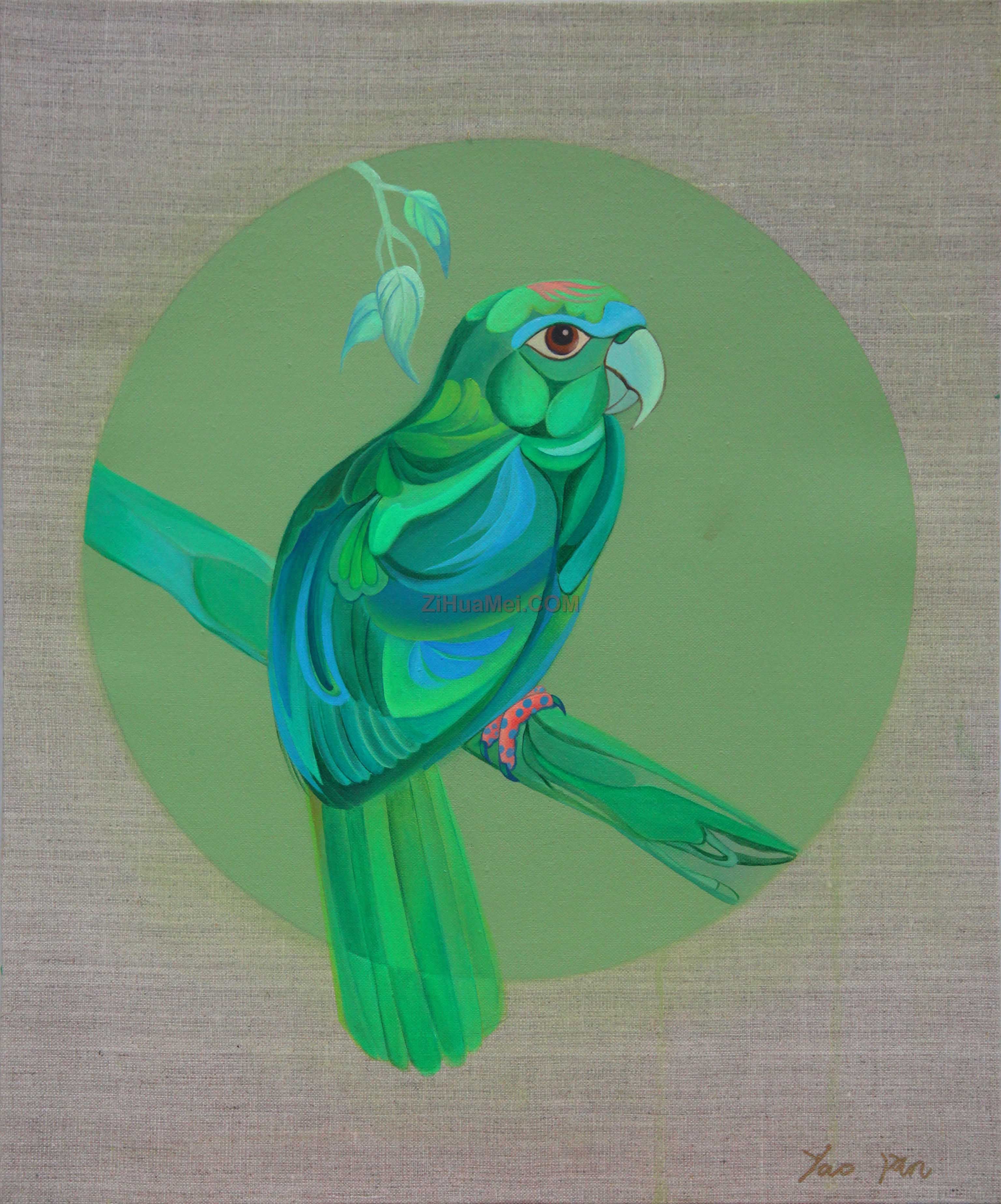 鹦鹉不凡系列创作灵感描述:艺术家童年时期喜爱鹦鹉纯任天真的性情,英武非凡的神姿,在成长的过程中独爱鹦鹉意象繁多的羽色。创作过程中,在表现色彩上又增添了清灵、透明。颜色鲜亮,笔法细腻,栩栩如生,细致勾勒又潜藏着暗流涌动的激情,颇有奇气。姚品笔下的鹦鹉动态、姿势、表情、思绪亦反映出人类的七情六欲,它需要你去细细看,慢慢地想,享乐在理解中,这也是既写实又糅合现代派手法的重要特征。