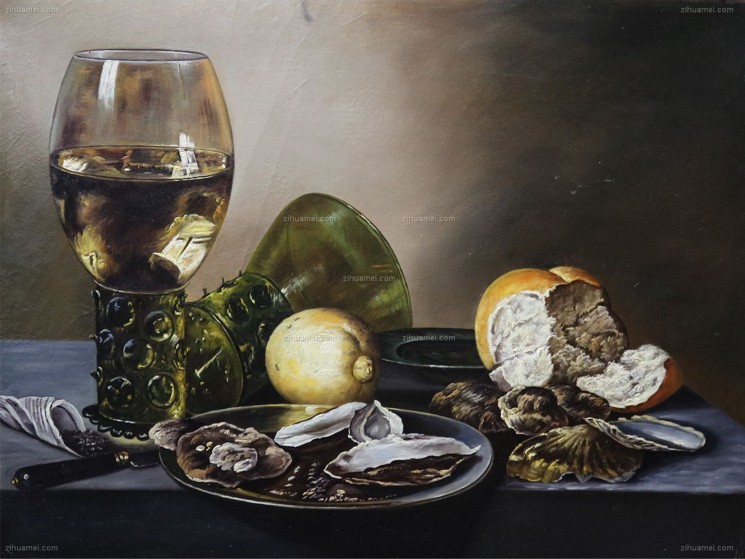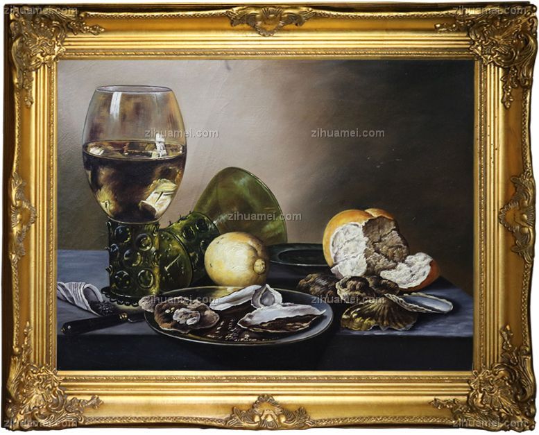 • 独家裂纹麻布油画 欧式经典油画 桌子上的面包 酒杯 水果